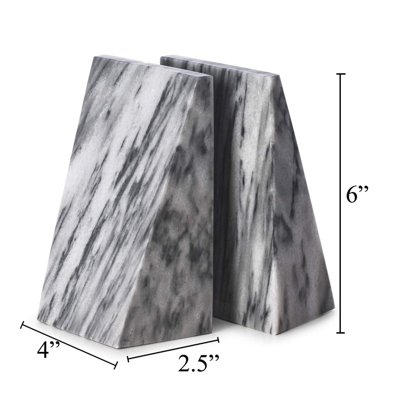 • These heavy grey triangular natural marble bookends will give a stylish and modern look to any bookshelf or desk. Each unique bookend is beautifully hand carved from solid marble stone and polished for a high gloss finish. They are cut in a triangular shape with veining.