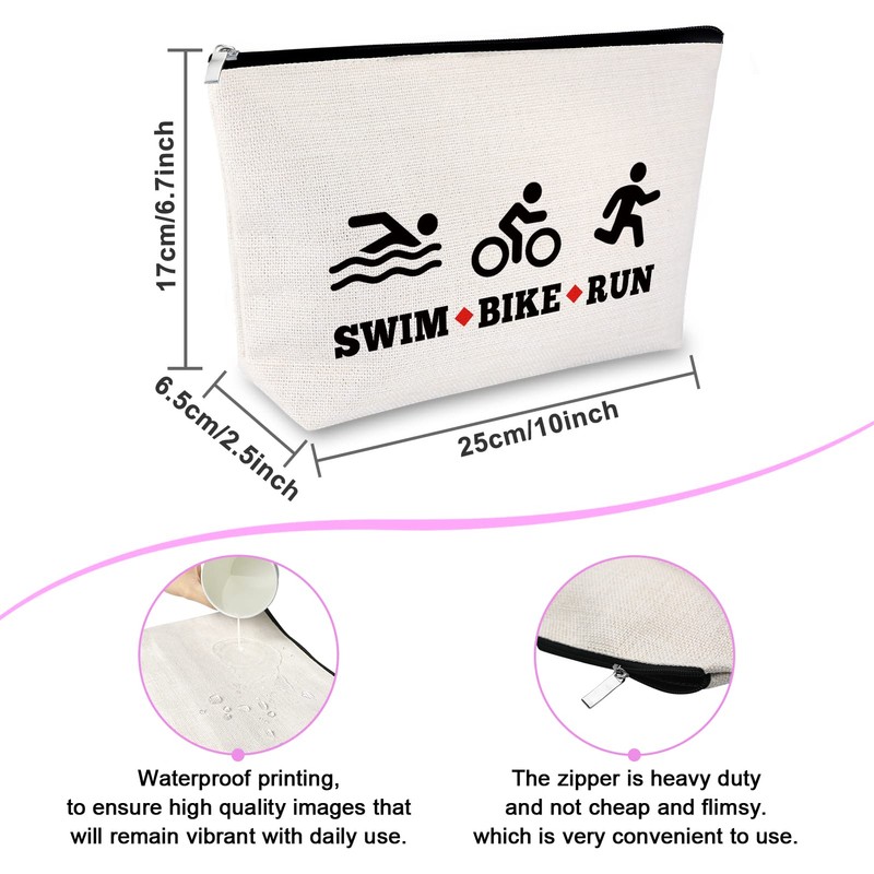 - Triathlon Gift for Women: The makeup bag printed with "swim, bike, run". The triathlon athletes need to work hard to complete three projects. Perfect gift for sister, friends, coworker, family, wife, daughter, mom, grandma, aunt, niece who love swim bike and run. You can show your appreciation and admiration to her who has completed a triathlon.