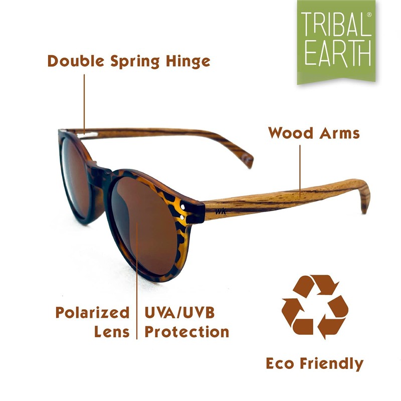 TRIBAL EARTH Polarised Wood Sunglasses have a tortoise shell polycarbonate frame with natural grain zebra wooden sunglass arms which makes each pair of the polarised sunglasses unique. Crafted with double spring stainless steel hinges that are outwardly flexible allowing for a comfortable fit. Lightweight for all day wearing. UV 400, Category 3 polarized lenses provide UV protection and a high level of sun glare reduction