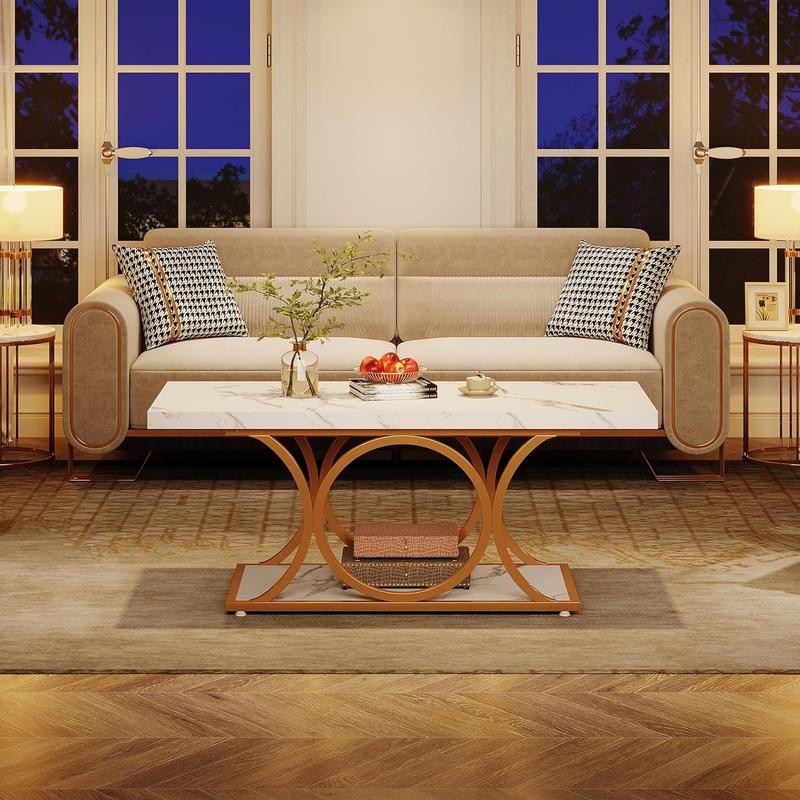 Add a touch of luxury with the Tribesigns 47.24" Modern Coffee Table. With its marble veneer top, metallic legs, and spacious shelves, it adds elegance while organizing your space. Its size and sturdy structure make it durable and practical for various living spaces. Easy to assemble in minutes!
