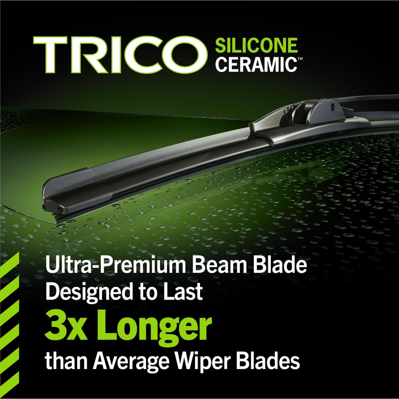 Come rain or shine, ensure a clear view on the road with TRICO Silicone Ceramic Super Premium Technology Beam Blades. These premium windshield wiper blades deliver complete visibility through your vehicle's windshield throughout every season whether there's rain, hail, sleet, or snow, allowing you to drive with confidence in all weather conditions. The high-quality silicone beam blade was designed and developed by the same engineers that design some of your most trusted OE wiper blades. The silicone compound helps repel water and ice even in the toughest conditions. Engineered to last three times longer than other average wiper blades, the passenger and driver windshield wiper blades feature an exclusive ceramic coating that provides unmatched protection against ozone, UV rays, and other element damage while reducing friction and drag. The aerodynamic airfoil design reduces wind lift to create maximum windshield contact for a clearer wipe while providing quiet operation with less chatter. Silicone Ceramic beam wiper blades are universal and fit several arm types, so you don’t have to worry about compatibility or another replacement and can enjoy a hassle-free installation within minutes. Simply connect, install, and wipe. Each box includes 1 driver side blade and 1 passenger side blade.