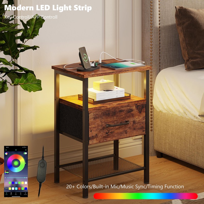 - Colorful & Smart LED Light StripThe TRIFEBLE bedside table features a multicolored LED light strip with more than 20 colors and 22 dynamic modes. By manual key or phone app, you can freely choose your favorite color, brightness level and flashing modes to create the perfect atmosphere.