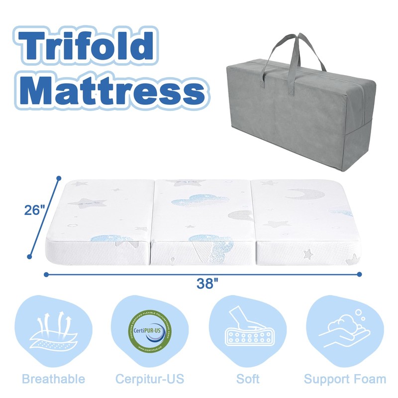 - Portable & Versatile: The trifold playpen mattress is foldable, lightweight, and portable. With the included travel bag, whether it's a family trip, visiting relatives and friends, or moving it around at home in daily life, it can be easily carried, providing a familiar and comfortable resting space for babies anytime and anywhere