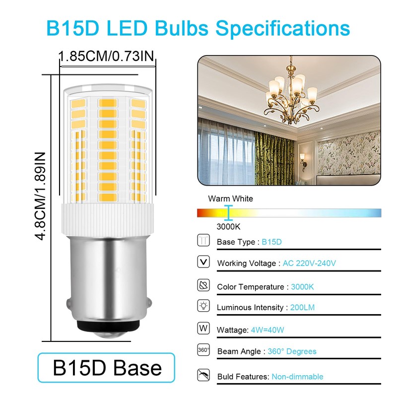 - Energy-saving: 4 W B15d LED lamp, equivalent to 40 W bulb, reduces power consumption. Lifespan of up to 25000 hours, reduces replacement frequency and saves time and money