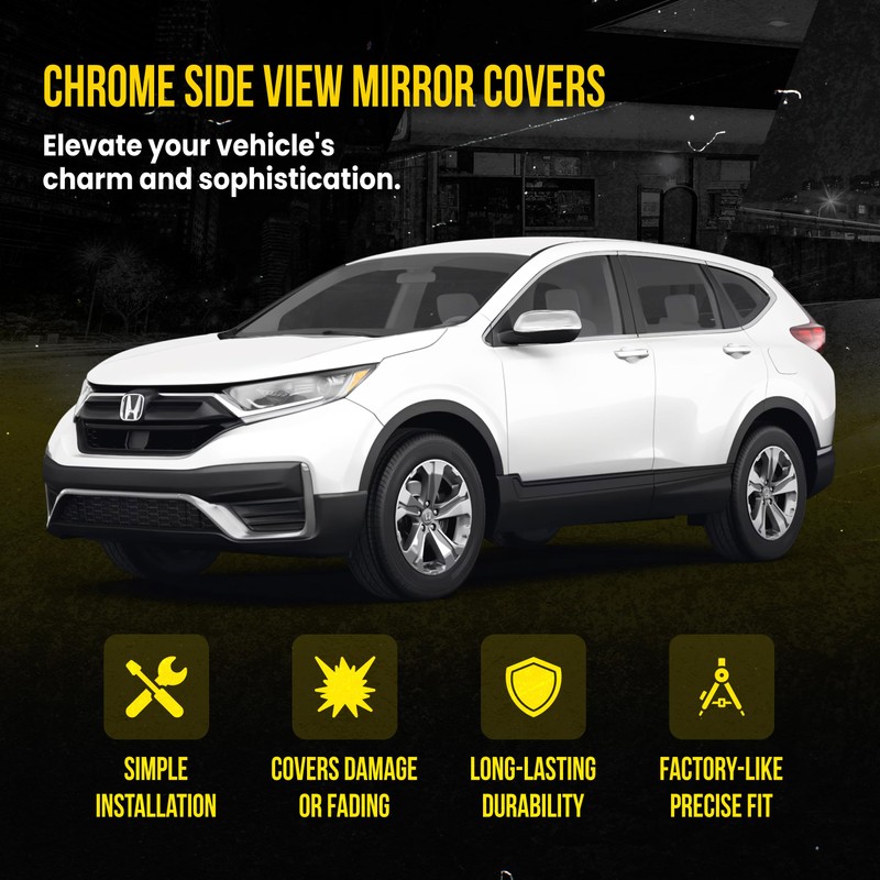 - SLEEK CHROME FINISH - Transform your ride with our side mirror caps, featuring a stunning chrome finish. The installation process of the side mirror covers is simple and straightforward. No need for special tools—just apply our tape-on chrome mirror caps effortlessly for an instant touch of class.