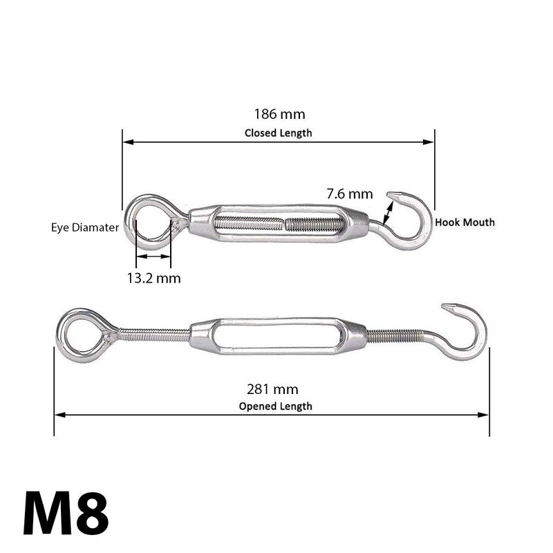 - STAINLESS STEEL WIRE TENSIONER: The turnbuckle wire tensioner is made up of stainless steel. This M8 rope strainer has close length 186mm, open length 281mm, shrank length 120mm, weight 128g, the diameter of eye hole 13.2mm, and hook mouth 7.6mm