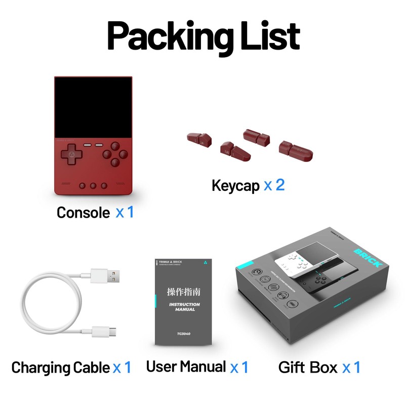 - Package Contains: 1x Trimui Brick Game Console, 1x 64G TF Card,2x Keycap,1x USB-C Charging Cable, 1x User Manual,1x Gift box,