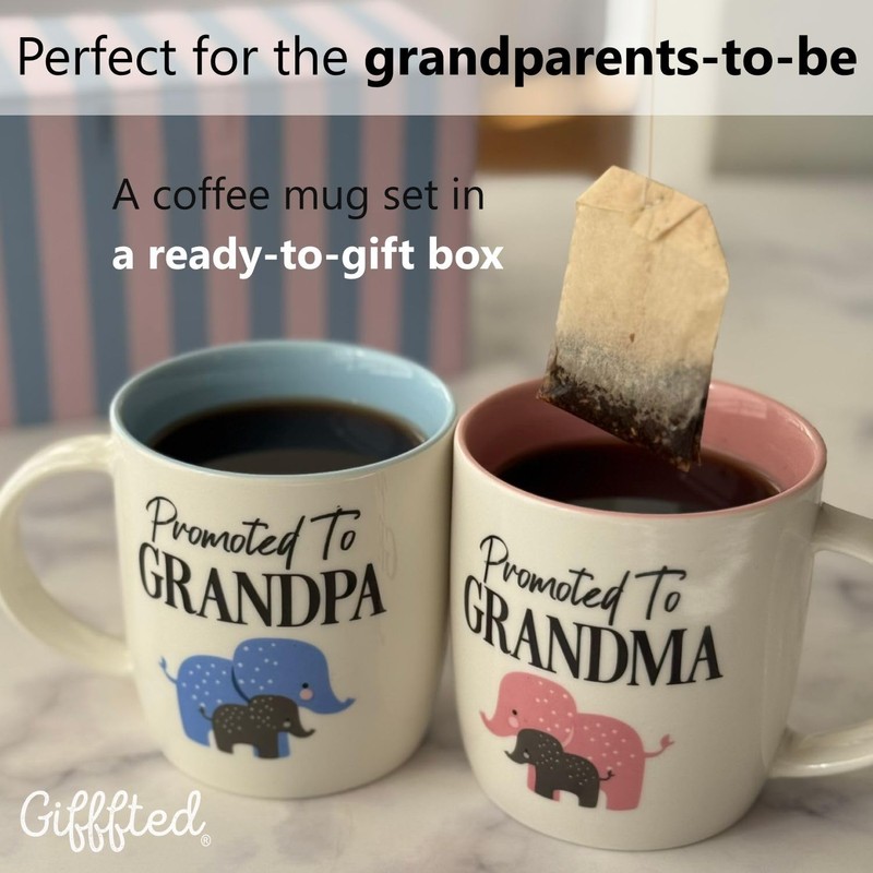 - Thoughtful Design for New Grandparents: Celebrate the special moment of becoming grandparents with this set of beautifully crafted mugs. Each mug features the phrases “Promoted To Grandma” and “Promoted To Grandpa,” adorned with cute elephant illustrations.