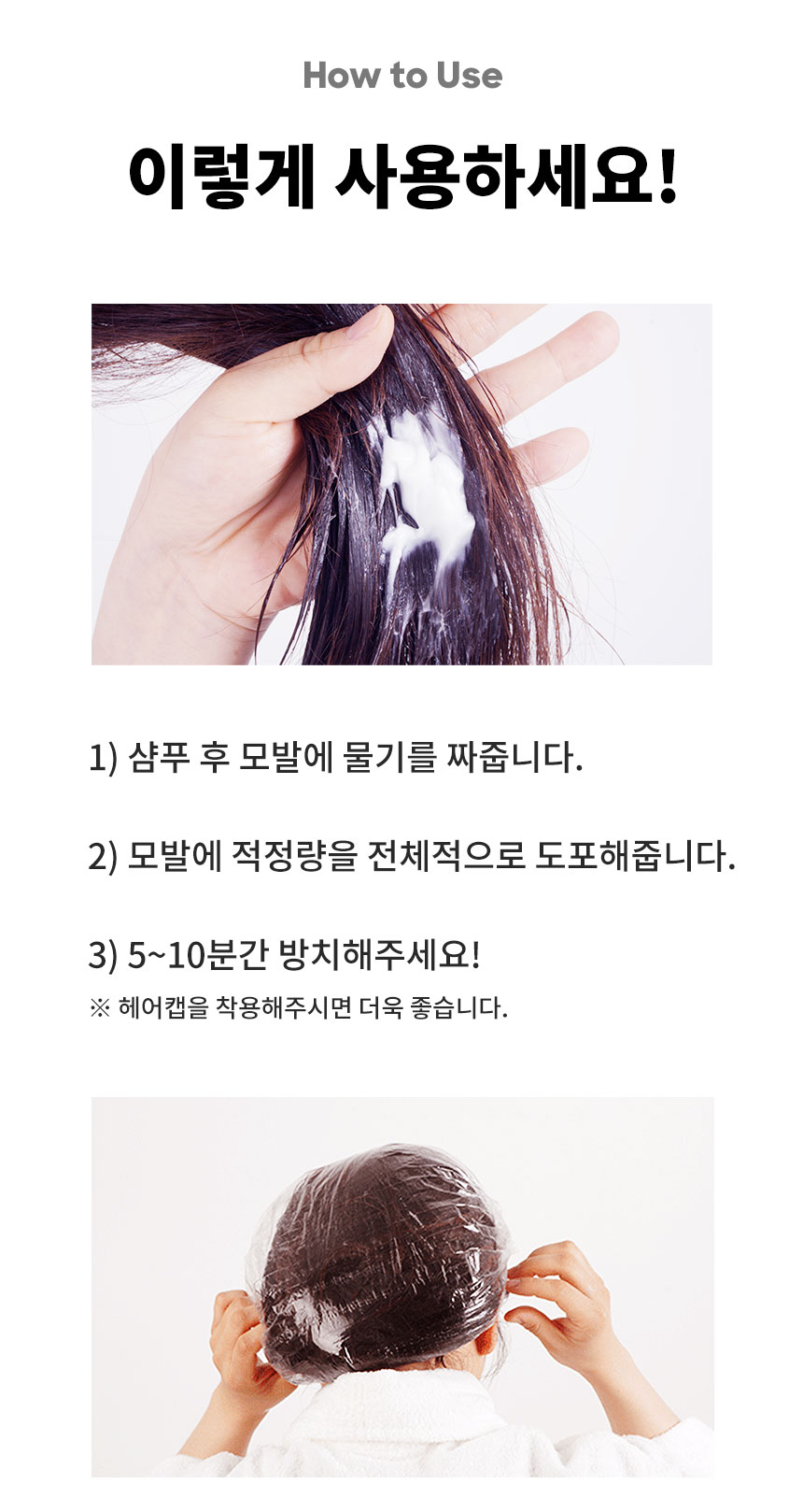 - How to use: After shampooing, remove the moisture from the hair and apply an appropriate amount of treatment according to the length of your hair by combing it with your hands. Afterwards, let it fully absorb into the hair for about 10 minutes and then rinse thoroughly.