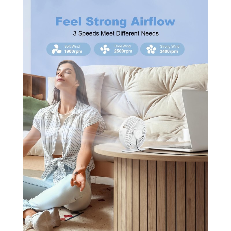 - 【3-Speed Strong Airflow】The USB desk fan, with upgraded brushless copper motor, has a longer service life and more powerful wind; The USB mini fan can be adjusted easily by pressing the button-Gentle wind (2.8m/s); Cool wind(3.8m/s); Strong wind (5.3m/s).