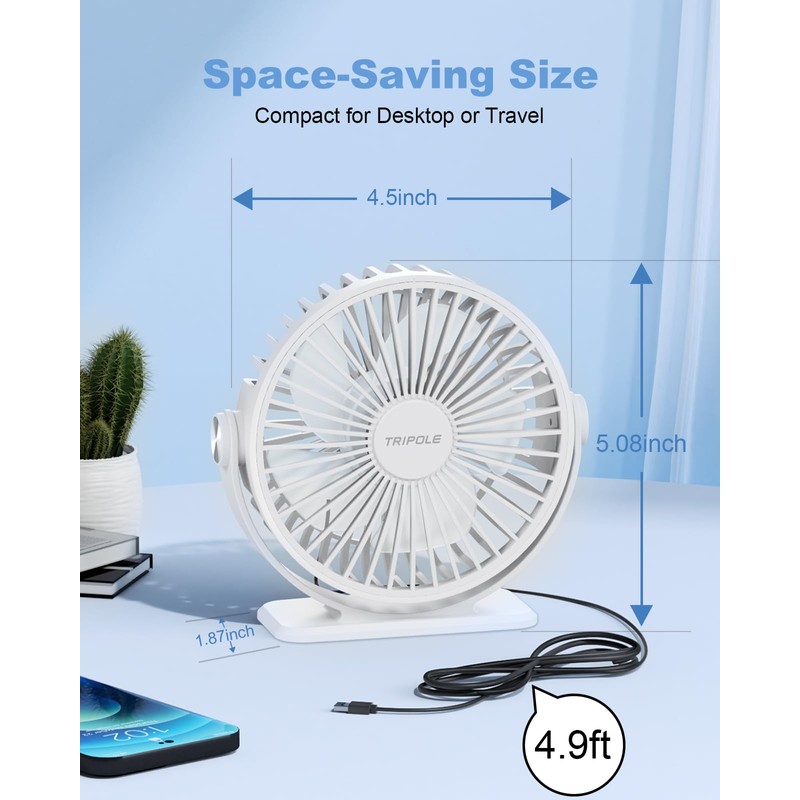 TriPole Desk Fan USB Powered Mini Portable Fan, 3 Speeds Adjustable Strong Breeze Personal Desktop Fan, 360° Rotation Quiet Plug In USB Fan for Bedroom Office Table Travel Cruise, White, 4.9ft Cable