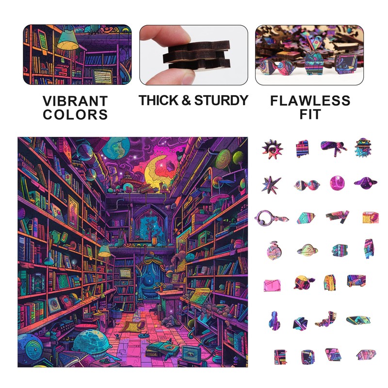- Vibrant Psychedelic Artwork: Features bold, colorful designs of a trippy library packed with books and artifacts, with a view of space and the moon, turning the completed puzzle into a frame-worthy piece of art.