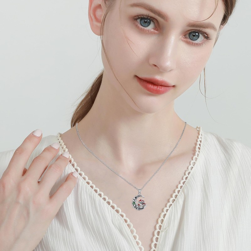 TRISHULA Moon Mushroom Necklace 925 Sterling Silver Red Mushroom Pendant Moss Agate Moon Phase Necklace Mushroom Jewelry Crescent Moon Jewelry for Women
