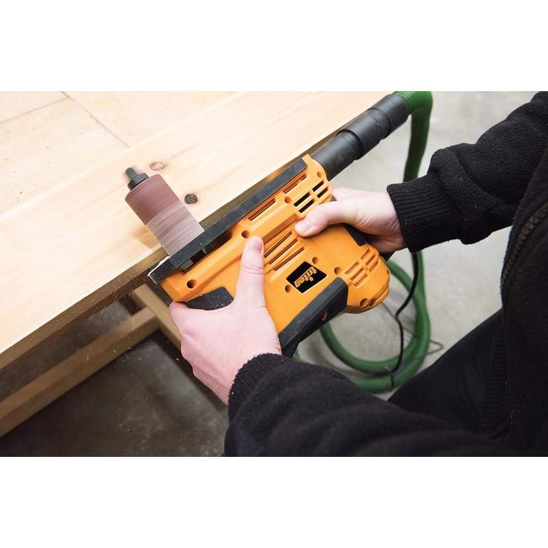 Portable, hand-held oscillating spindle sander for controlled, burn-free edge sanding for cabinetry, sign making, sink openings, and woodworking. Dual- action rotating and vertical oscillation for fast sanding and improved work rate. Lightweight and powerful, with a 650W motor that operates at a variable speed 1800 - 3200rpm and oscillates at 50 - 90opm. Dust extraction port with removable adaptor for work with a dust extraction system. Adjustable edge guide for controlled material removal. Bench-mounted inversion kit with non- slip bench mat and adjustable clamps for versatile sanding. Quick-change rubber sanding drums and sanding sleeves in sizes Ø13, 19, 26 and 38mm. Includes sander, 4 x sanding drums, 4 x sanding sleeves, dust port adaptor, inversion kit, and adjustable edge guide.