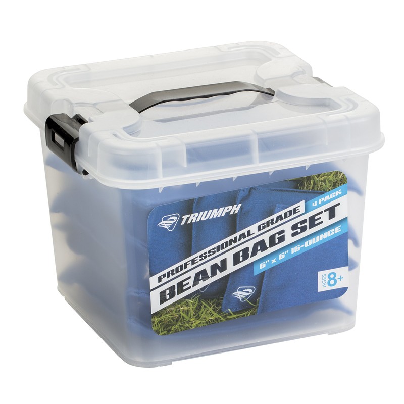 Forget trying to repair your old bean bags and upgrade to the Triumph Black Canvas Duck Cloth Bean Bag Set. The 16-ounce bean bags feature a durable duck cloth exterior that allows you to enjoy hours of fun playing bag toss with family and friends. The 6” x 6” square black bags have an ultra-lightweight interior liners to enclose any pellet dust and eliminates any mess. When finished playing, easily transport and store the bean bags in the included clear plastic storage container with two locking clasps. The set of four professional grade bean bags also are available in black, blue, grey, red, and yellow.