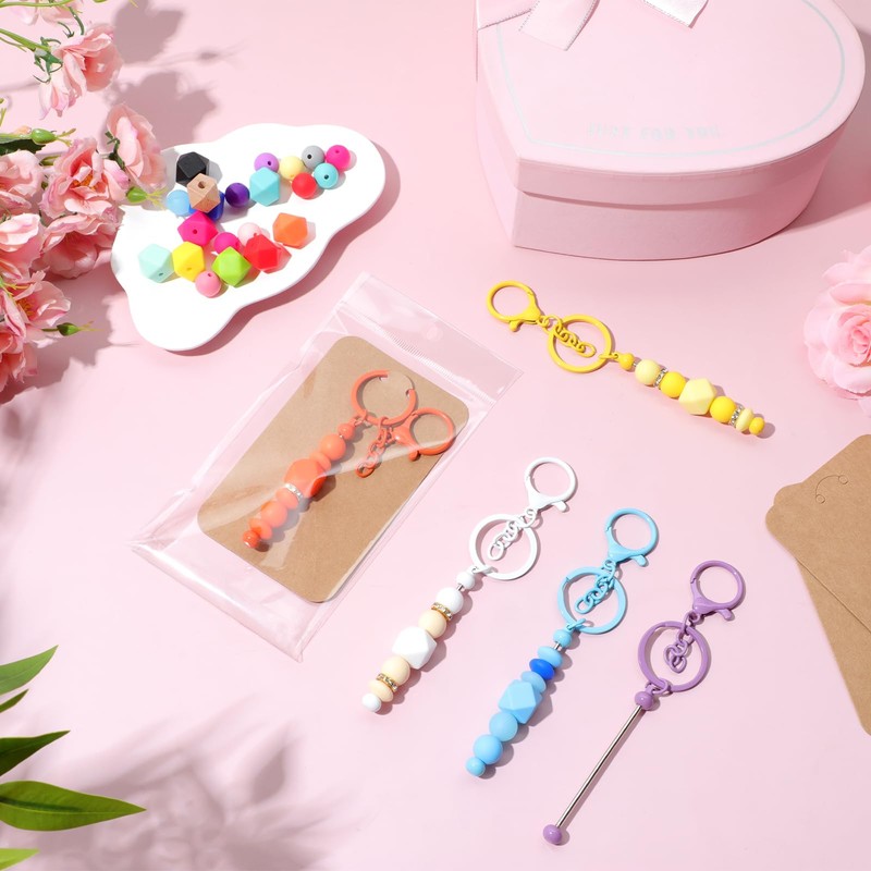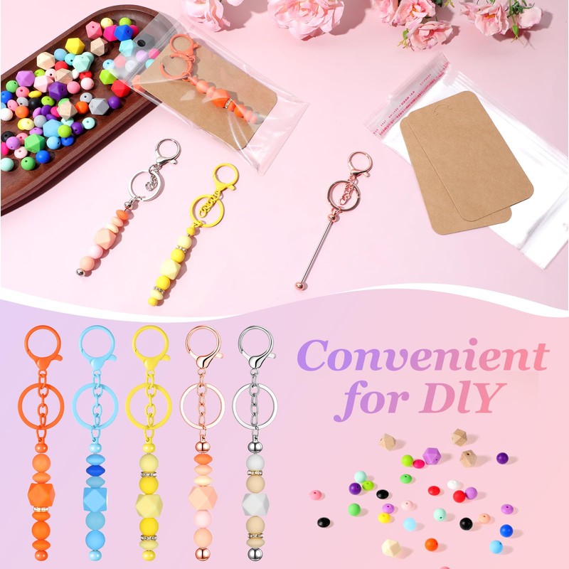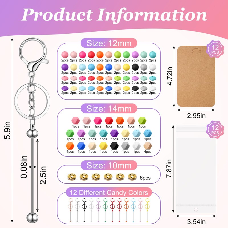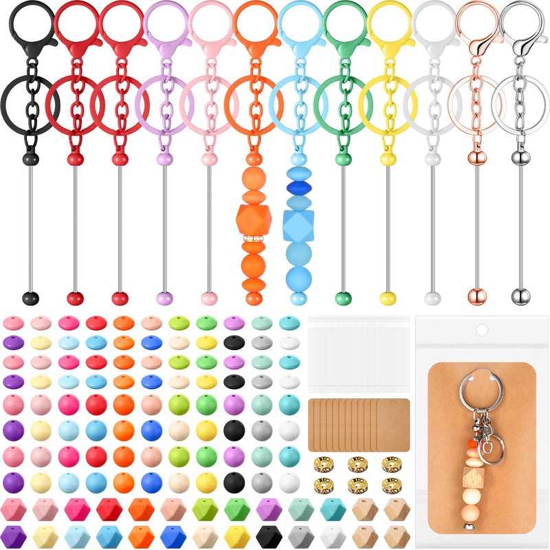 - You Will Get: dive into creativity with our comprehensive set, featuring 12 beadable keychain bars, 120 vivid color beads (108 silicone round and lentil beads in 18 colors, 8 polygonal wooden beads, and 4 metal beads), plus 12 display cards and 12 packing bags; Everything you need for your DIY projects