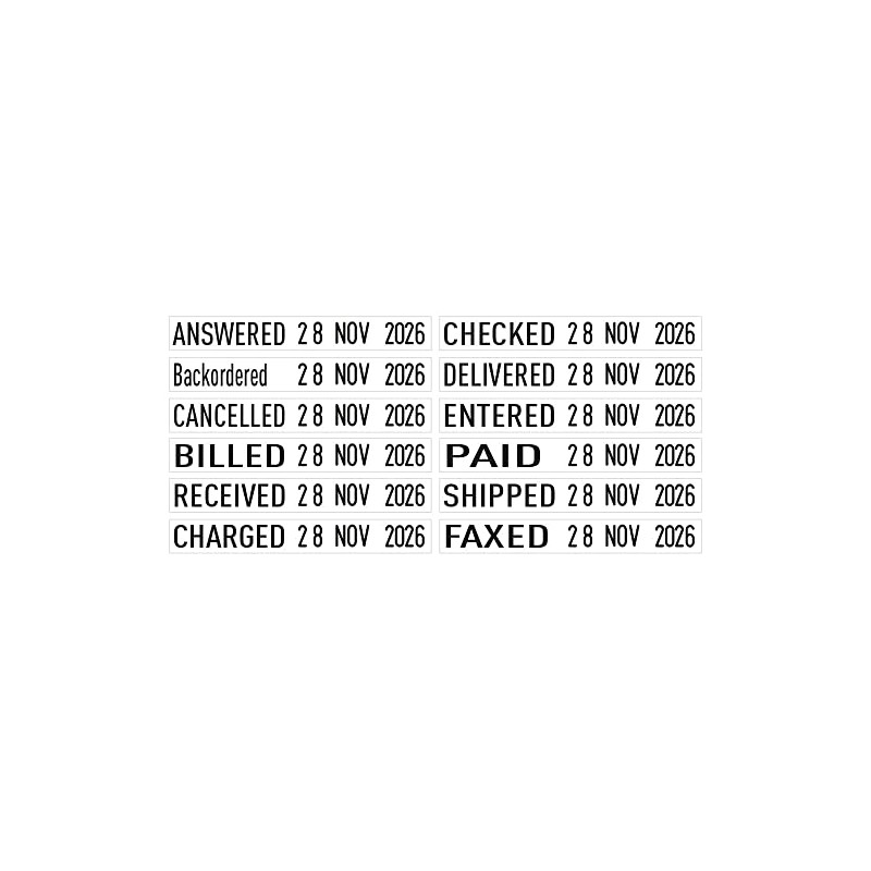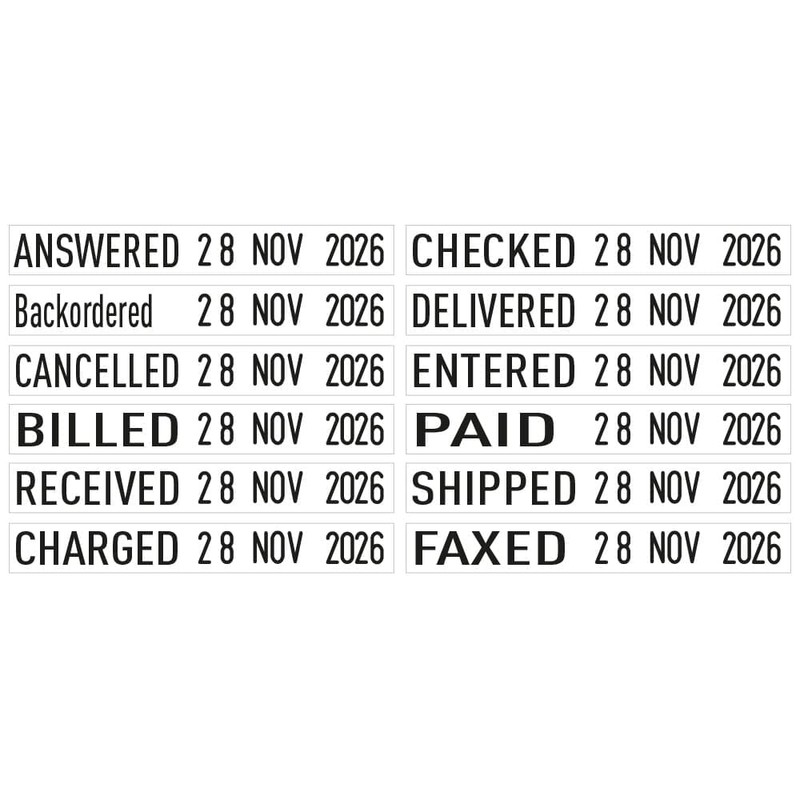 • Date in combination with 12 popular office phrases – ANSWERED, BACKORDERED, CANCELLED, BILLED, RECEIVED, CHARGED, CHECKED, DELIVERED, ENTERED, PAID, SHIPPED and FAXED.
