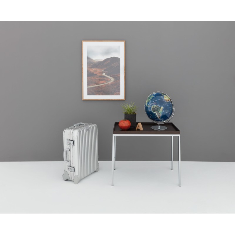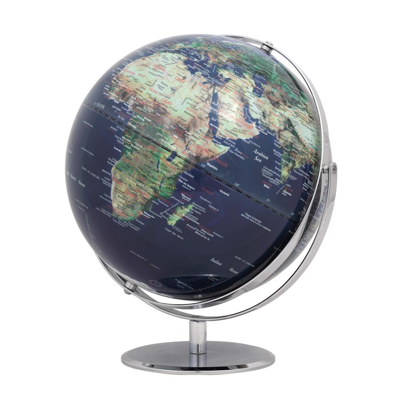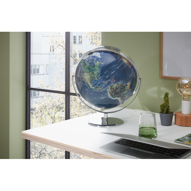 The 300 x 360 mm JURI table globe combines puristic design with high functionality and quality. Thanks to its two axes, the globe can be rotated in all dimensions and gives a clear view of all corners of the world. The globe has a chrome-plated metal frame and a metal base. Depending on your wishes, it is available with a chrome-plated metal base and with shiny globe or alternatively with a black matte metal base and with matte globe.