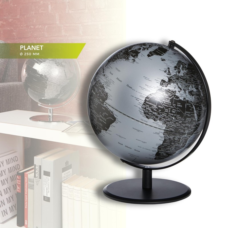 - TROIKA Original globe with 25 cm diameter. Modern table globe with a total height of 30 cm, rotatable on a sturdy matt black metal base. Impressive design and high quality finishes. Felt lined to protect furniture surfaces. Matte two-tone planet globe with black land areas and silver seas, inscribed in English, with continents, oceans, countries, geographical zones and major cities.