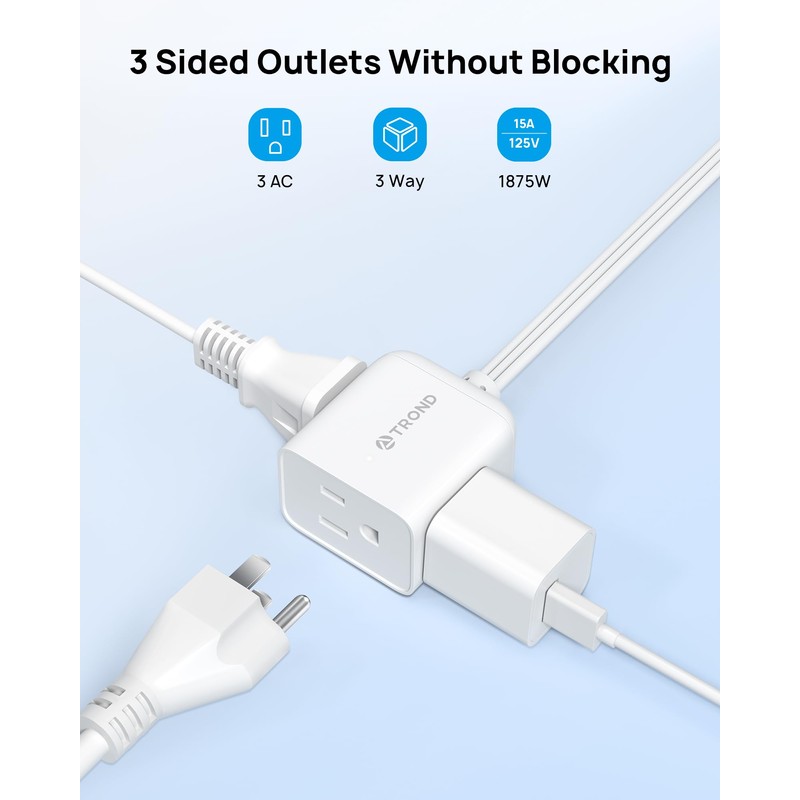 • 3-Way Angled Outlet Adapter: The plug extender features a trapezoidal shape with AC sockets positioned on three different sides. This angled outlet splitter is designed to accommodate devices with large chargers or irregularly shaped plugs, without any obstructions or interference
