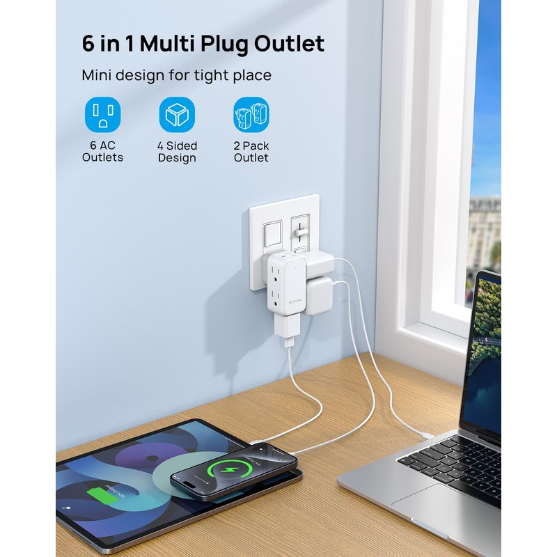 This outlet splitter can charge up to 6 devices at the same time. You can charge your smartphones, tablets, and so on simultaneously. 2-pack is more practical, and you can plug in both plug extenders at the same time to charge up to 12 devices.