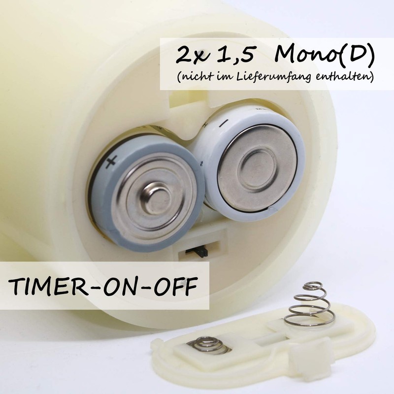 - SUPERLANGE BRENNDAUER - Bei Betrieb mit 2 Alkaline Batterien Mono D 1,5V (optional), werden Leuchtzeiten bis zu 1000 STUNDEN erreicht. Das bedeutet eine Laufzeit in der Timerfunktion von bis zu 200 TAGEN!