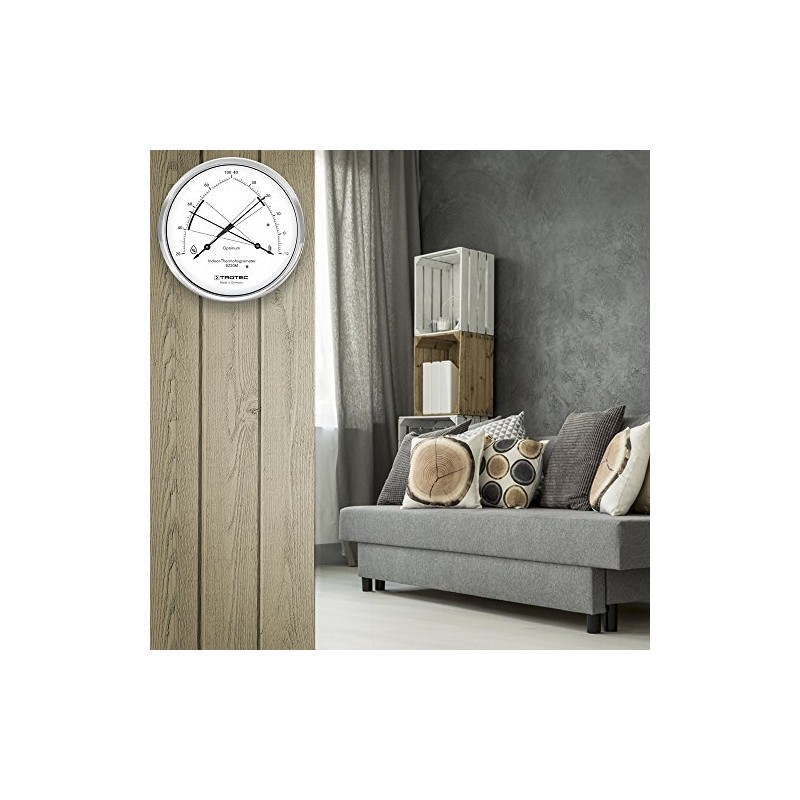 - Thanks to the refined hand arrangement, it is visible at a glance when the climate values are in an optimal range: as long as the hands of room temperature and humidity cross over the grey marked field, the climate in the room is perfect.