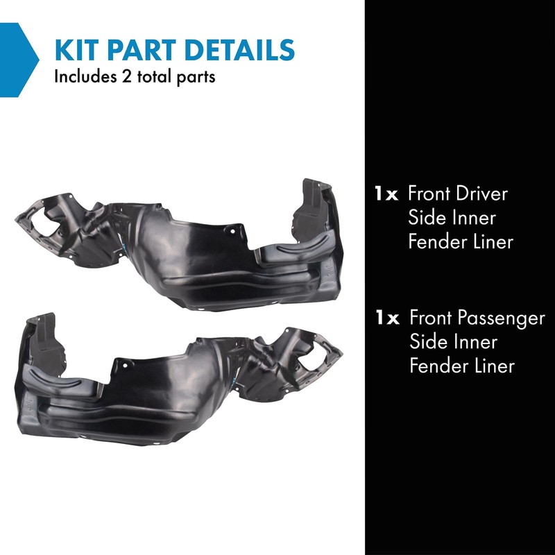 - Kit Includes:(1) Front Driver Side Inner Fender Liner; (1) Front Passenger Side Inner Fender Liner