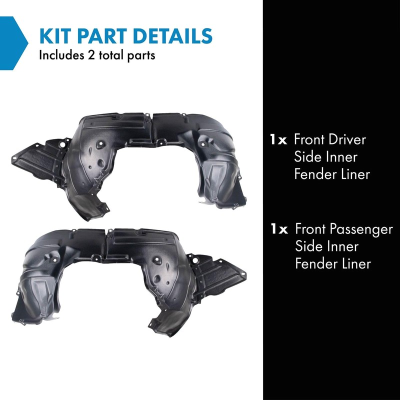 2 Piece Inner Fender Liner SetKit Includes(1) Front Driver Side Inner Fender Liner(1) Front Passenger Side Inner Fender LinerFitmentCompatible with: 2017-19 Nissan Sentra SR TurboCompatible with: 2017-19 Nissan Sentra NismoProduct AttributesQuantity: 2 PieceReference NumbersNissan: 63840-4FU0A, 638404FU0APFM, 63841-4FU0A, 638414FU0APFMPartslink Numbering System: NI1248162, NI1249162