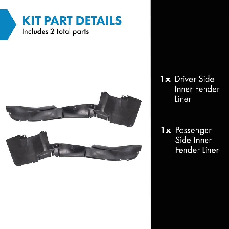 - Kit Includes:(1) Driver Side Inner Fender Liner; (1) Passenger Side Inner Fender Liner