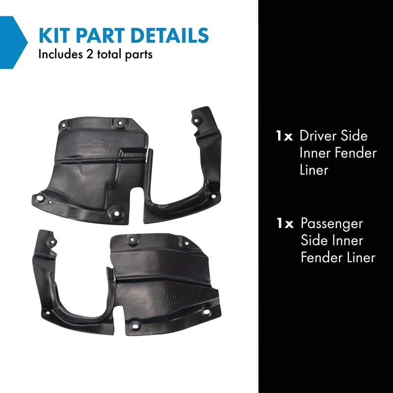 - Kit Includes:(1) Driver Side Inner Fender Liner; (1) Passenger Side Inner Fender Liner