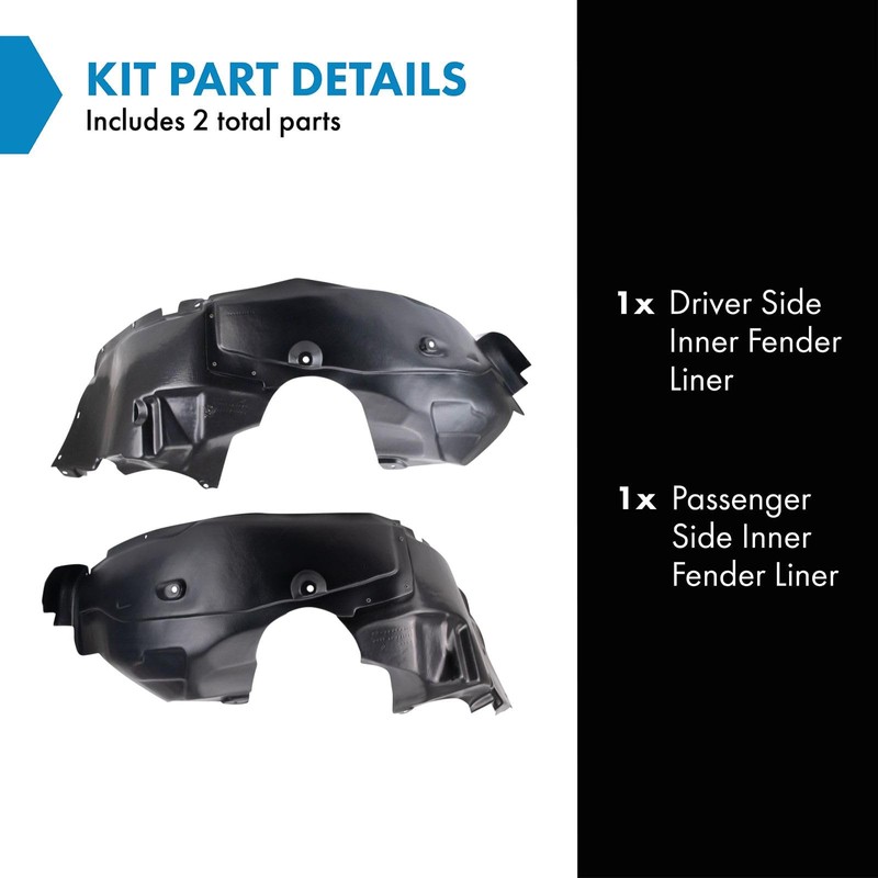 2 Piece Inner Fender Liner SetKit Includes(1) Driver Side Inner Fender Liner(1) Passenger Side Inner Fender LinerFitmentCompatible with: 2011-14 Dodge Avenger Driver & Passenger SideProduct AttributesQuantity: 2 PieceReference NumbersDodge: 5008914AE, 5008914AF, 5008915AF, 5008915AGPartslink Numbering System: CH1248159, CH1249159