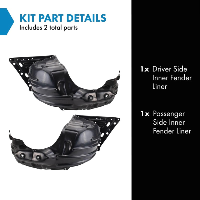 2 Piece Inner Fender Liner SetKit Includes(1) Driver Side Inner Fender Liner(1) Passenger Side Inner Fender LinerFitmentCompatible with: 2017-20 Mitsubishi Mirage Driver & Passenger SideCompatible with: 2014-15 Mitsubishi Mirage Driver & Passenger SideProduct AttributesQuantity: 2 PieceReference NumbersMitsubishi: 5370A925, 5370A926Partslink Numbering System: MI1248130, MI1249130