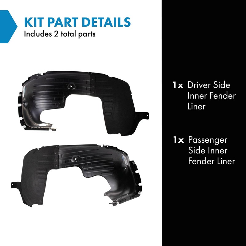 2 Piece Inner Fender Liner SetKit Includes(1) Driver Side Inner Fender Liner(1) Passenger Side Inner Fender LinerFitmentCompatible with: 2016-18 Kia Optima Driver & Passenger SideProduct AttributesQuantity: 2 PieceReference NumbersKia: 86811 D5000, 86811-D5000, 86811D5000, 86812 D5000, 86812-D5000, 86812D5000Partslink Numbering System: KI1248152, KI1249152