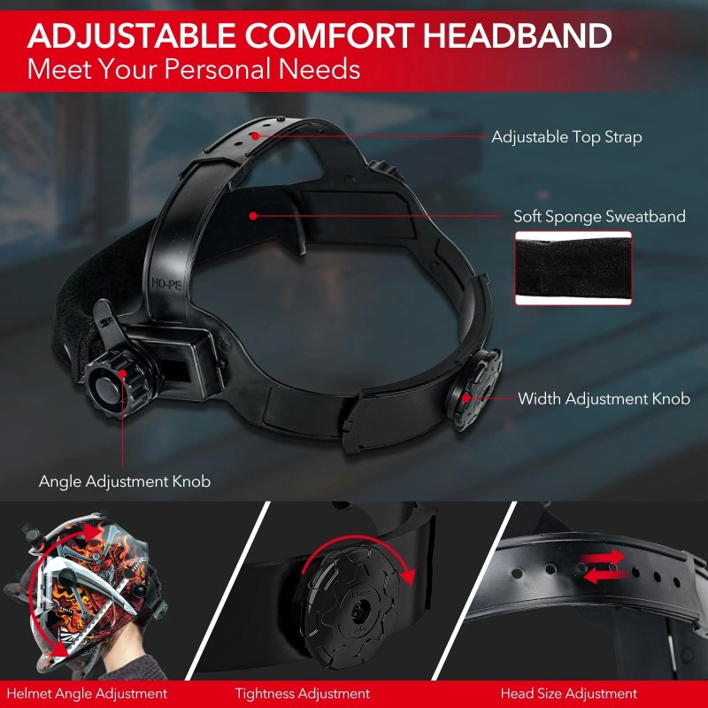 【Comfort Durable Welding Mask】Balanced with an adjustable and comfortable headgear. Ergonomically welding helmet makes it comfortable and easy to wear. Thickened sponge forehead will protect you from injury. The knobs on both sides can adjust the angle, and the knob at the back can adjust the tightness of the headband, suitable for people with different head circumference