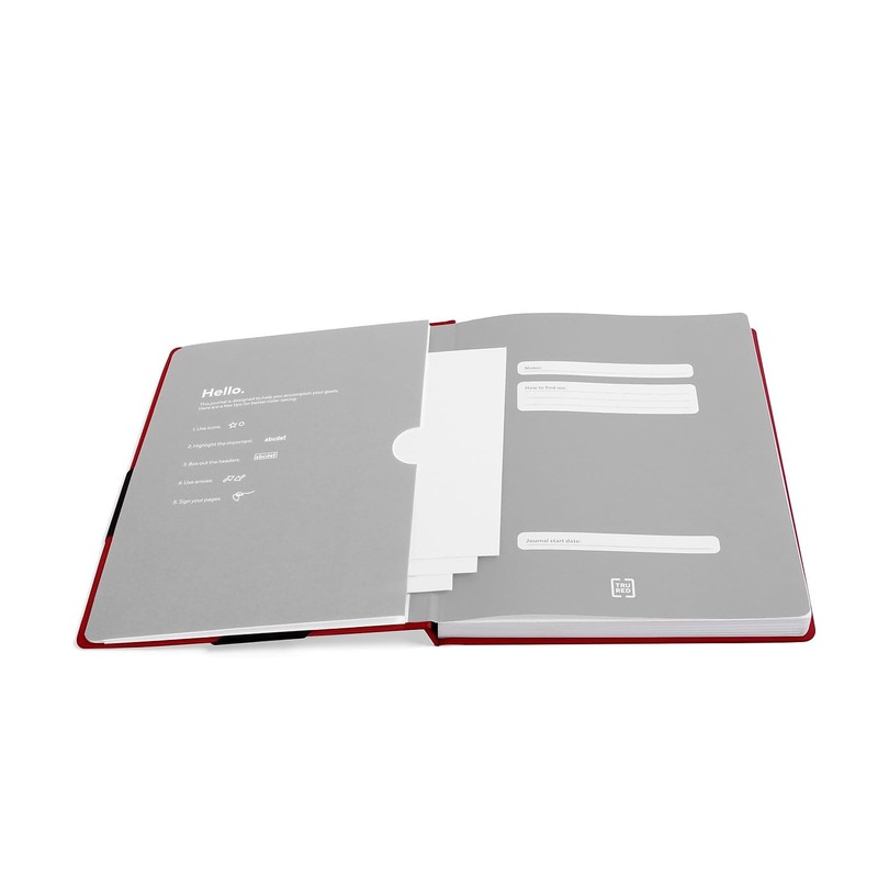- Secure your journal closed with the elastic strap. Store important documents in the inside front cover pocket. Red textured hardcover.
