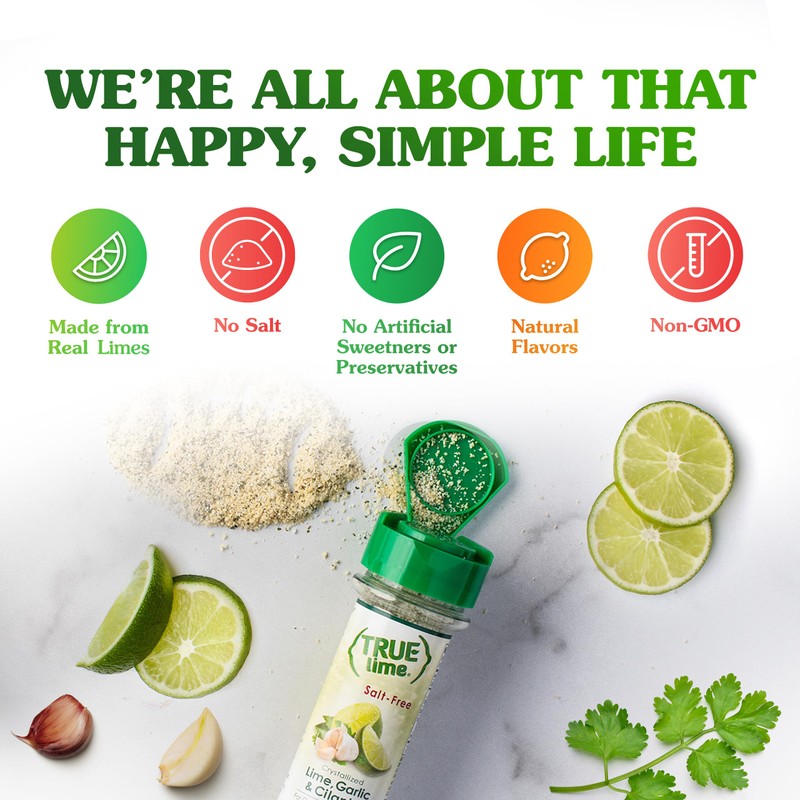 - A tasty alternative to lime juice and/or salty seasonings, True Lime Garlic and Cilantro always delivers consistent taste in every shake! Halt the salt, and not the flavor.