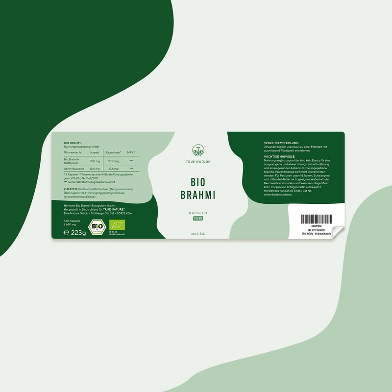 TRUE NATURE Bacopa Monnieri Brahmi - High Dose: 1,500 mg with 2.5% Bacosides - Big Pack: 360 Capsules - Organic Brahmi Capsules, Small Stonecrop - Ayurveda, vegan - No additives - TRUE NATURE