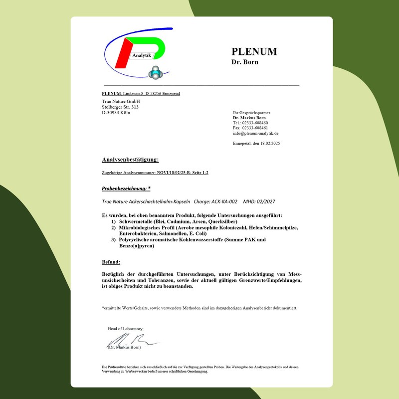- TRUE INGREDIENTS - Dein Ackerschachtelhalm oder auch Horsetail ist ein Premium-Rohstoff aus China, der unter h?chsten Standards gewonnen wird. Trotz reinster Verarbeitung vor Ort zertifiziert* (siehe Laborzertifikat/ Analysebest?tigung in den Produktbildern) ein unabh?ngiges deutsches Labor die Reinheit jeder Charge. Der Rohstoff wird in Deutschland gem?? ISO- und HACCP-Standards abgefllt.