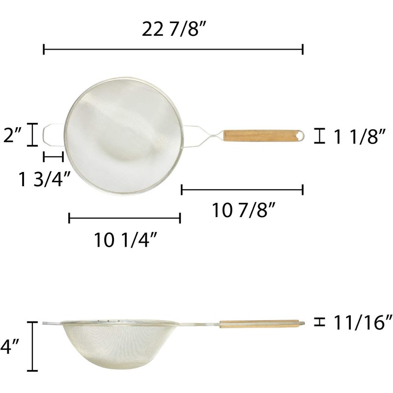 - Measures 10" Diameter x 5-1/2" Height, 13" Handle Length, Medium Single Mesh Strainer, Tin Mesh with Flat Wooden Handle