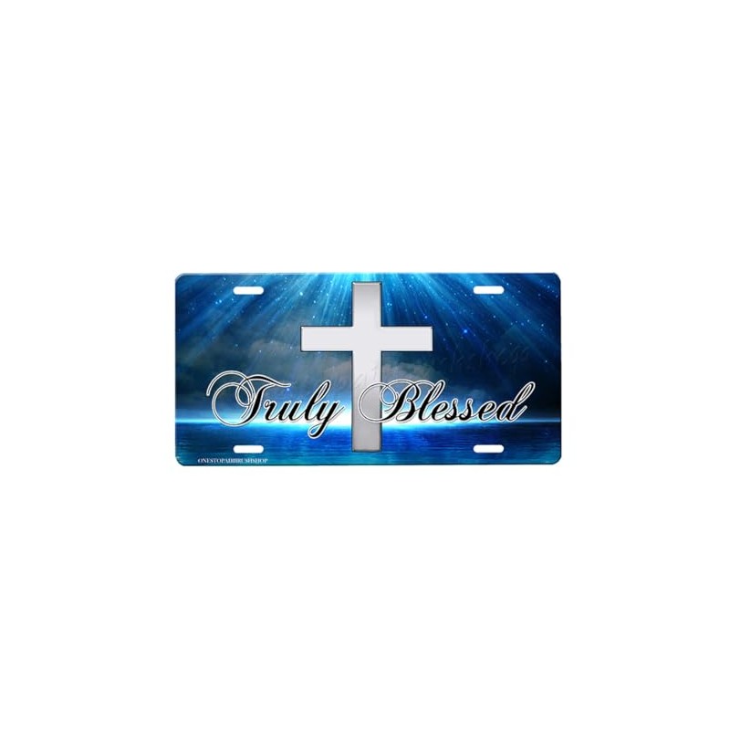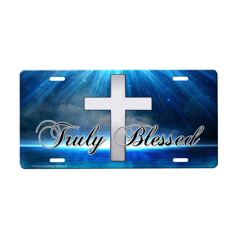 Truly Blessed Cross Front Novelty Car Tag Sign with Custom Background Options