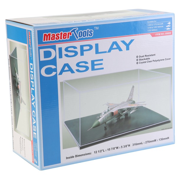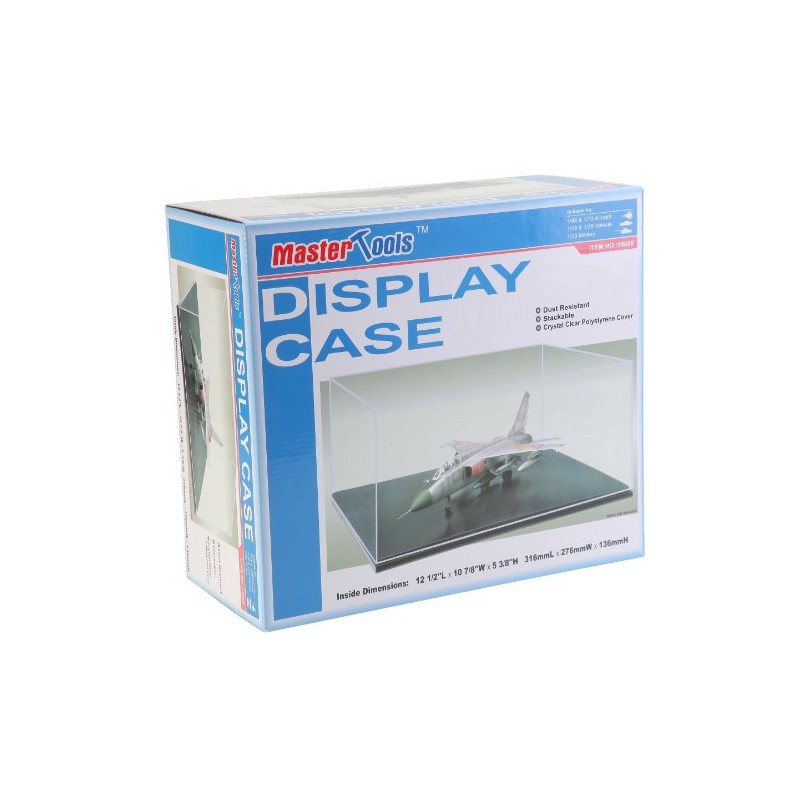 Plastic display case with black base, suitable for 1/48 and 1/72 aircraft, 1/18 and 1/25 vehicles, and 1/35 military.