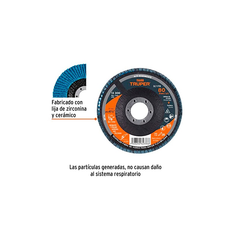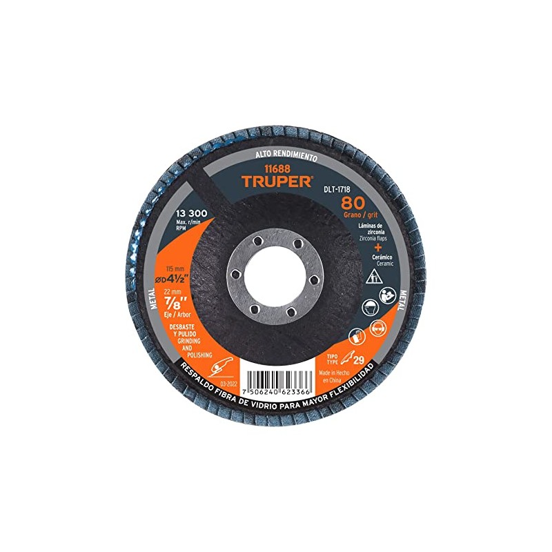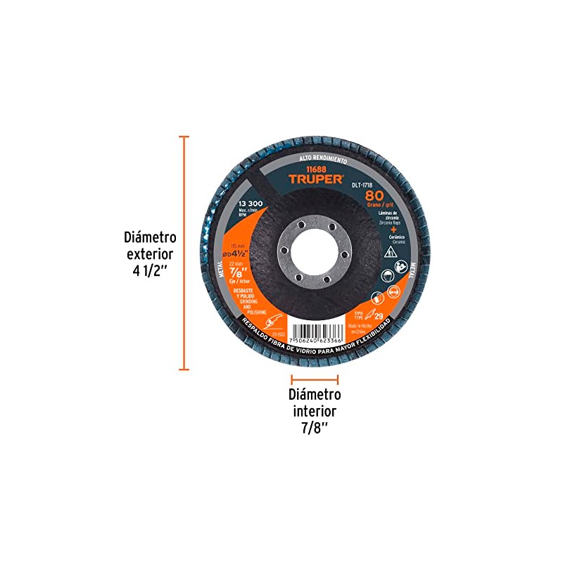 Truper DLT-1718, Disco laminado, alto rendimiento, diámetro 4 1/2", 7/8", grano 80