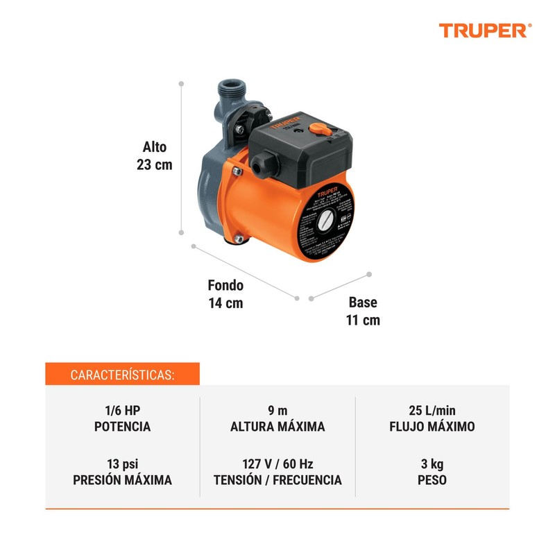 Truper 1/6 HP Pressurizing Pump, Black, Industrial, Plastic, 25 L/min Flow, 9m Max Height