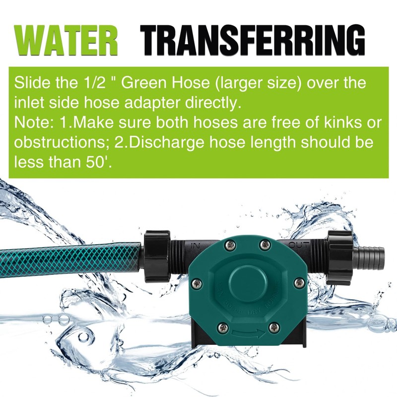- 【WATER & OIL TRANSFER】--Specially oil resistant impeller designed make it not only pump water, but also avilable for oil transferring. Included 1x drill pump; 2x hose adapters; 1x rubber sheathed hose connector; 2x rubber washers; 1x 1/2" green water hose; 1x 1/4" clear plastic oil suction tube.