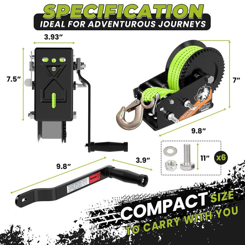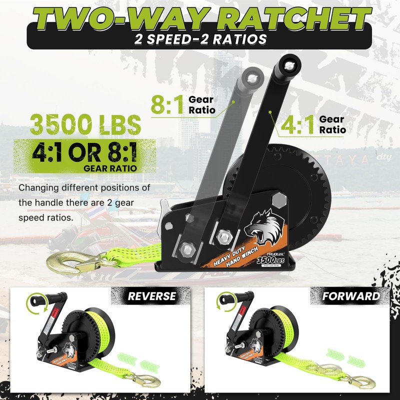 - [Dual-Direction Ratchet System] This hand crank winch supports forward and reverse towing thanks to a 2-way ratchet mechanism equipped with safety pawls. Two-speed functionality allows you switch between fast retraction and controlled pulling, making it a reliable tool for boats, trailers, and Jet Ski.