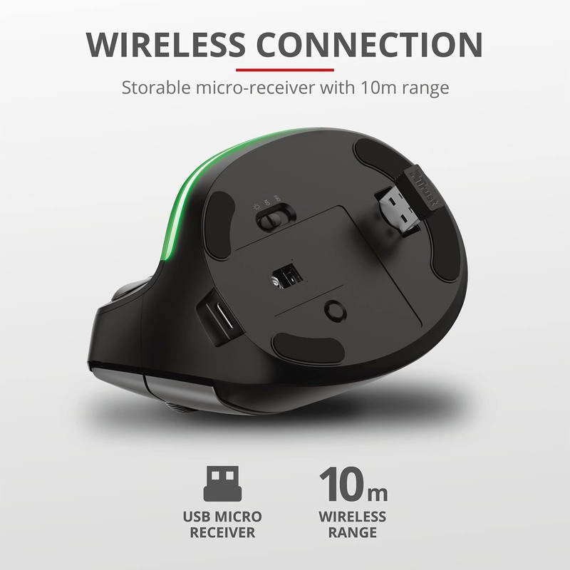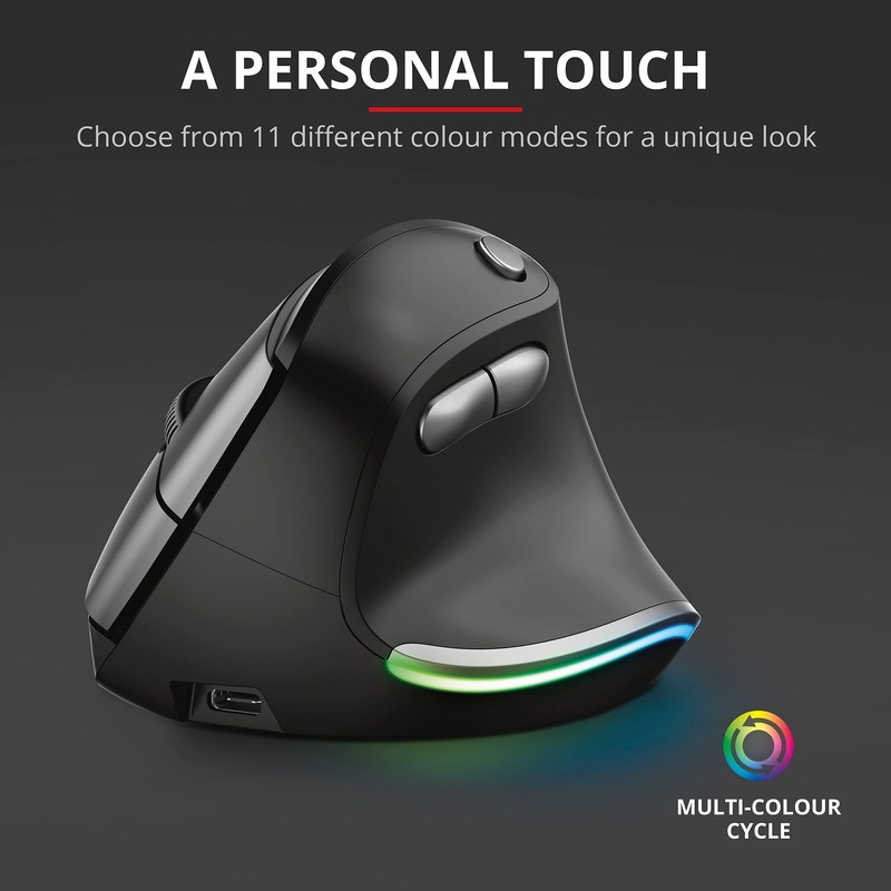 Trust Bayo Vertical Mouse, Rechargeable Ergonomic Mouse, 800-2400 DPI, RF 2.4GHz, 6 Buttons, USB Receiver, 10 m Range, RGB Light, Wireless Mouse for PC, Laptop, Mac - Black