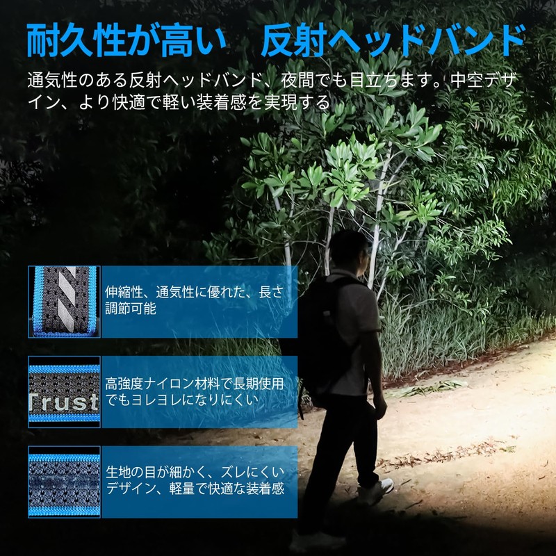 - Lightweight and 180° Adjustable: The main unit is only 4.2 oz (109 g), and is lightweight and compact, so you can wear it for long periods of time without stress on your neck. The headlamp head is properly adjustable to 180°, and can be firmly fixed to prevent shaking and sliding while driving. The head flashlight uses a strap with high elasticity/breathability and reflective strip, so you can be seen at night. Great for outdoor activities such as climbing, fishing, camping, hiking, and car maintenance