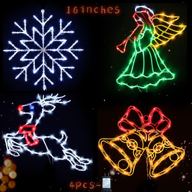 TRWYMZ Christmas Decorations - 16" Christmas Window Silhouette Lights - 4 Pack Colour Lighted Snowflake & Angel & Reindeer & Bell for Holiday Indoor and Outdoor Wall Door Window Decorate