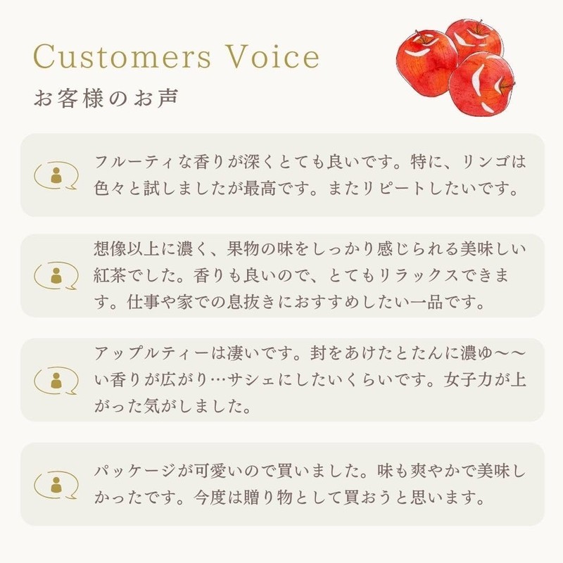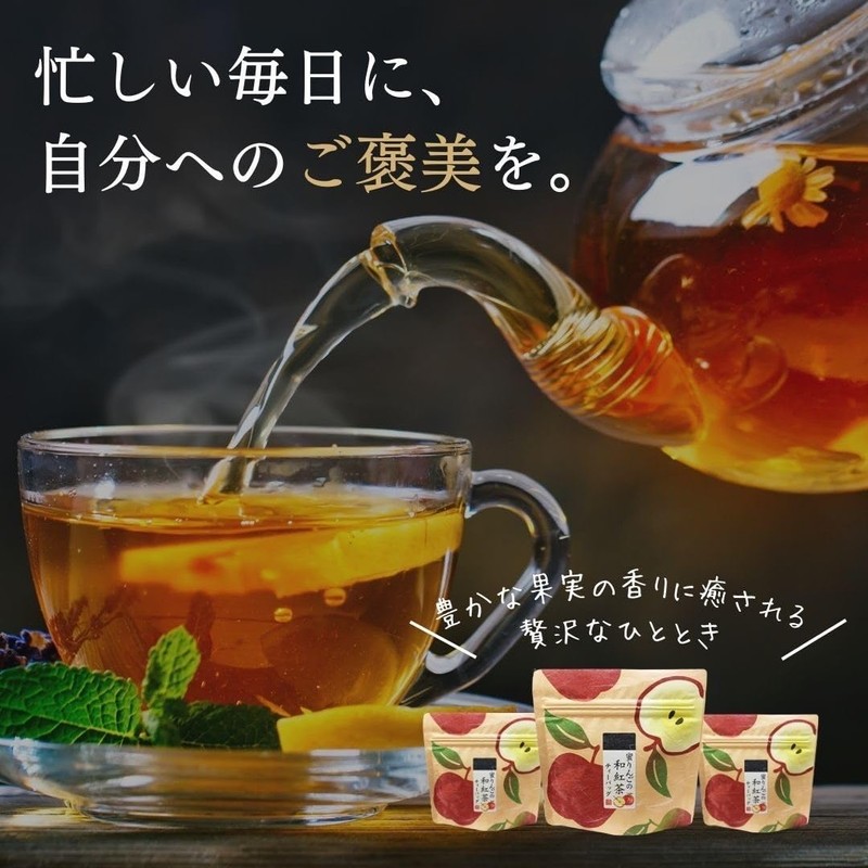 - Ingredients: Tea (from Shizuoka Prefecture), dried apple (from Aomori Prefecture), fragrance